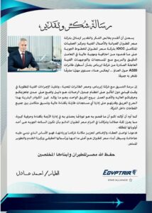 وختم رسالته بدعوة جميع العاملين إلى مواصلة العطاء والإخلاص للحفاظ على المكانة الريادية للشركة، مؤكداً أن أبناء مصر للطيران هم الثروة الحقيقية التي تقود مسيرة التطوير والنجاح المستمر.