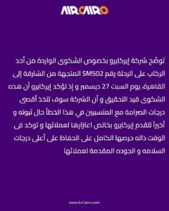 أعلنت شركة إير كايرو فتح تحقيق رسمي وعاجل في الشكوى المتداولة عبر مواقع التواصل الاجتماعي بشأن ما شهدته الرحلة رقم SM502 المتجهة من الشارقة إلى القاهرة يوم السبت 27 ديسمبر الجاري، مؤكدة أن الواقعة تخضع حاليًا لفحص دقيق وشامل للوقوف على جميع ملابساتها.