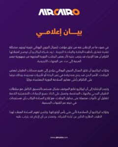 واختتمت إيركايرو بيانها بالتأكيد على أن سلامة الركاب تأتي على رأس أولوياتها، معربة عن تقديرها لتفهم العملاء لهذا الظرف الطارئ الخارج عن إرادة الشركة، ومقدمة اعتذارها عن أي إزعاج قد ينجم عن هذه التطورات