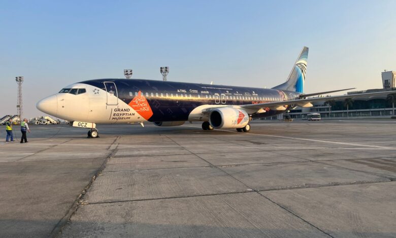طائرة مصر للطيران المزيّنة بشعار المتحف الكبير تجوب العالم برسالة من أرض الفراعنة