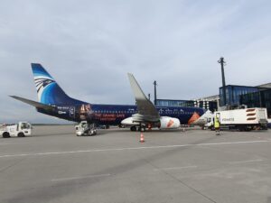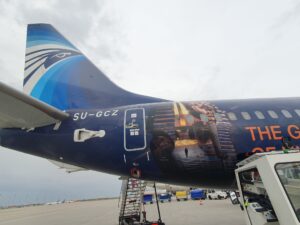 طائرة مصر للطيران المزيّنة بشعار المتحف الكبير تجوب العالم برسالة من أرض الفراعنة