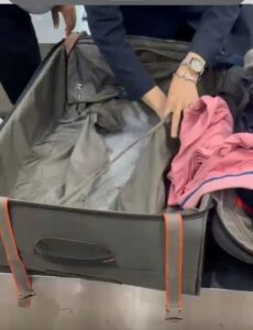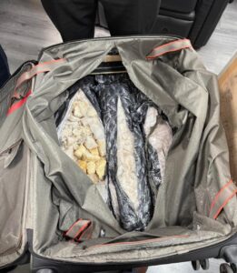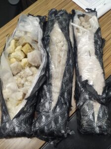 و تبيّن وجود كثافات عضوية داخل الحقيبة، لتُكلف مأمورة الجمرك فاطمة محمد عبده بتفتيشها يدويًا، حيث عثرت على قاع سحري مُعدّ بإحكام يضم ثلاث لفافات مغلقة بكربون أسود وغلافًا شفافًا يحتوي على مادة بلورية.