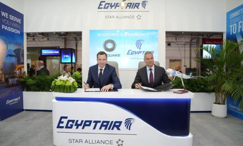 وجرى التوقيع الرسمي خلال المعرض بين كلٍّ من الطيار أحمد عادل رئيس الشركة القابضة لمصر للطيران، وإيمون باين الرئيس التنفيذي لشركة Macquarie، في خطوة تُعد امتدادًا للشراكة الناجحة بين الجانبين، ودعمًا لخطة الشركة الطموحة لتحديث أسطولها والتوسع في تشغيل الوجهات بعيدة المدى.