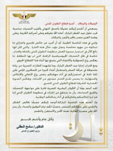 واختتم الحفني رسالته بتوجيه الشكر والتقدير لجميع العاملين بالقطاع، مثمنًا عطائهم المستمر، ومتمنيًا لهم دوام التوفيق والسداد، وأن يعيد الله هذه المناسبة المباركة على مصر بالخير واليُمن والبركات.