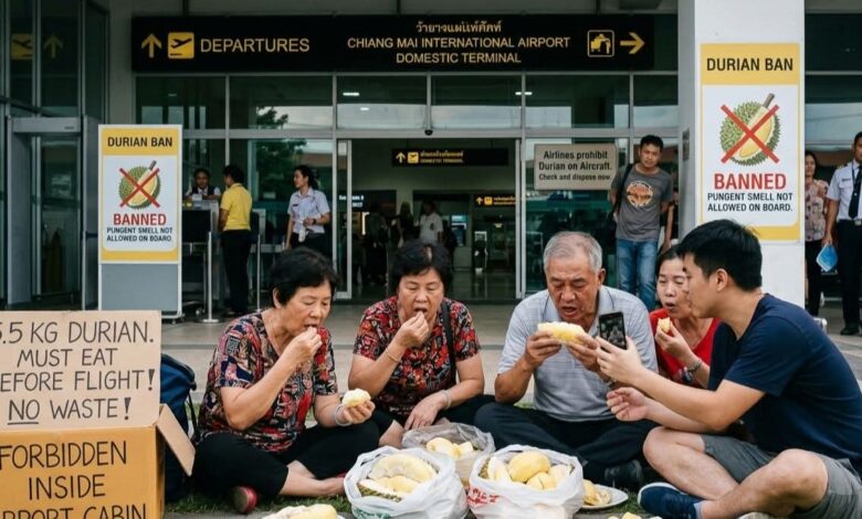 شهد مطار مطار تشيانغ ماي الدولي واقعة طريفة ومحرجة في آنٍ واحد، بعدما وجدت عائلة صينية نفسها أمام مأزق غير متوقع بسبب فاكهة “الدوريان” الشهيرة، المعروفة برائحتها النفاذة والمثيرة للجدل.